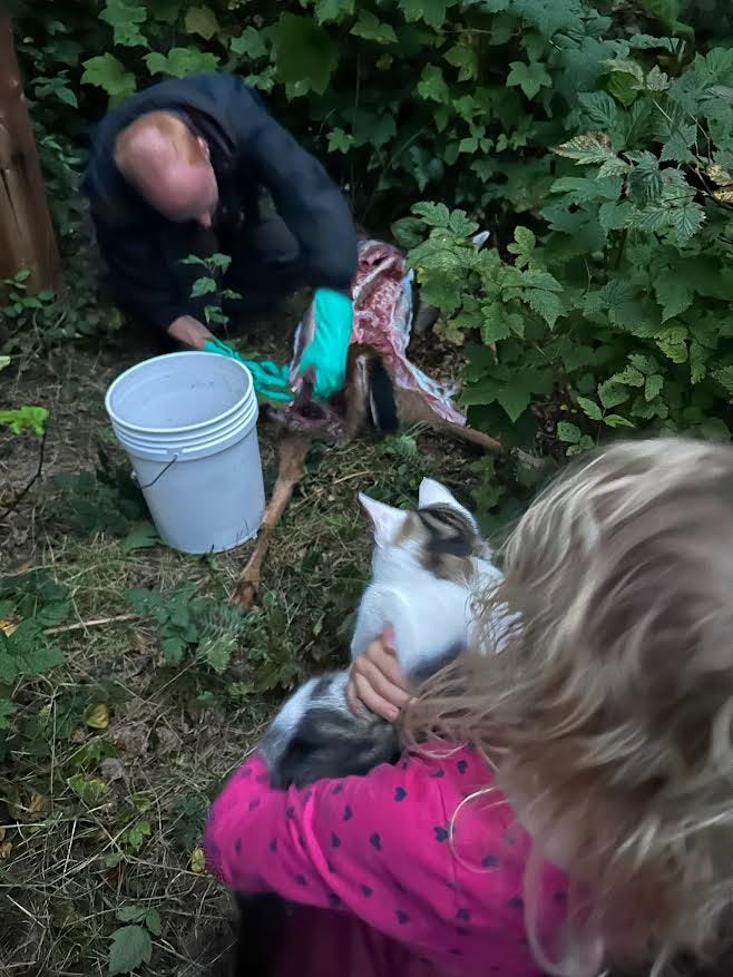 So I mostly tried to carry on with my normal business. Masha and I went into Port Angeles, searched for cool rocks on the shore, and got crepes at the Pink Pony Cafe. That evening, KC brought home a roadkill deer that we processed and cooked for Basil, the big white guard dog. KC talked us through it all, showing us how to tell if the meat was safe for humans to eat, if it was safe for animals, or if it needed to be thrown away. He told us that using fresh roadkill to feed animals is not only cheap, but it’s environmentally conscious and reduces waste. He is able to get thousands of dollars worth of meat from roadkill each year not only for his animals, but for his family and friends. This reduces their consumption of beef as well as the money they would spend on buying meats. I felt less sad than I anticipated, more reverent. I saw it less as being a part of the deer’s death and more as helping provide life to others. My perspective on the consumption of meat has completely changed since working on these farms. I often think of something Mokey Moon told us on our previous farm: how can I eat an animal I never knew? I went to the grocery store yesterday and stood in the meat isle trying to decide which bacon to buy. I found myself wanting to know the animals, how they were raised, how they died. After being so connected to my food, it was so completely strange to know nothing. How can we reconnect?