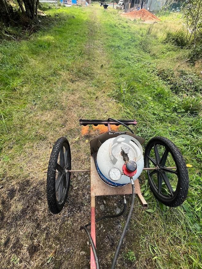 Now it’s time to tell you about the dreaded flame weeder. First, let me describe it to you. It’s similar to a push lawnmower, except instead of blades, it has cylindrical torches at the bottom. And it runs on propane. To light it, you have to turn on three knobs (each one adjusts the level of propane coming out) and then put your hand under the cylinders and click a lighter, pulling your hand away quickly so as not to get burned by the high blast of flames. Unfortunately, there is no gauge to tell you how much propane is coming out, and you can’t tell by the sound either. Because there are three knobs, and because multiple people use the same machinery, it can be hard to know which knobs are turned up or down when you first turn it on.