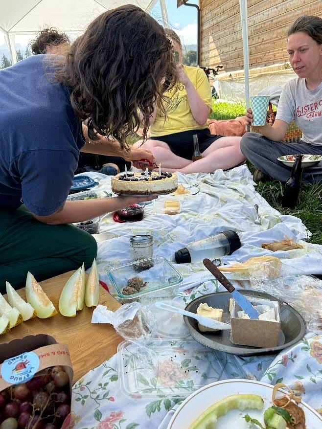 After working, we sat down for a delicious potluck lunch with homemade tamales, salads, meatballs, cheese and fruit, and TWO homemade cheesecakes. We celebrated one of the farmers’ birthdays, had a lively discussion about sneezing, and learned about efforts to radicalize delivery truck drivers across the United States. It was a lovely day full of great conversation, and I again felt accepted by total strangers. We were brought into a new community that shared their food, laughter, and stories with such willingness. I was even invited to contribute to a reproductive rights zine some of the farmers are working on. I left feeling like I had found what I was looking for, like this example of a farming community was what I wanted to be a part of.